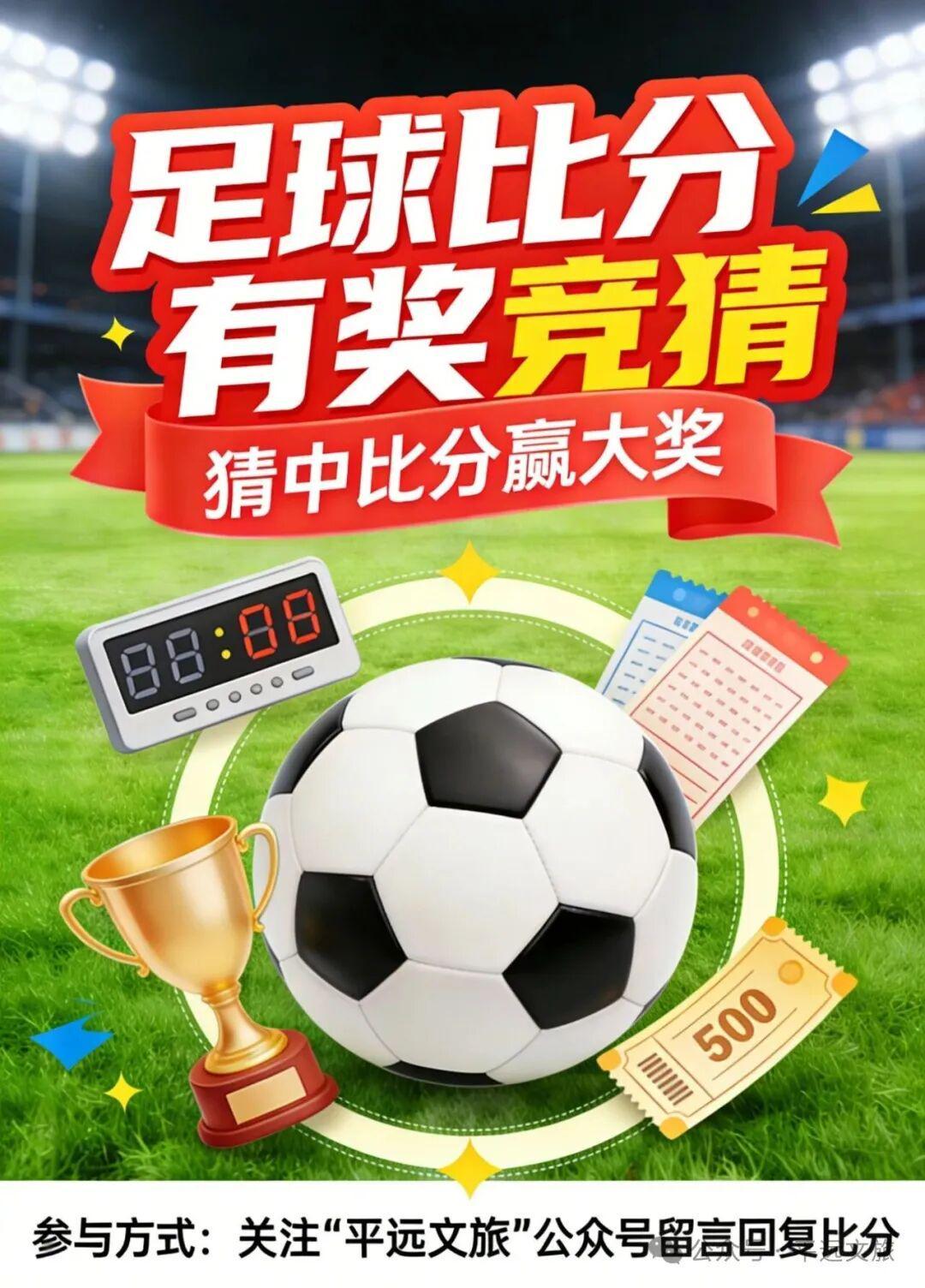 关注 “平远文旅” 微信公众号、视频号,即可参与每场比赛比分竞猜,精准猜中赛事最终比分,将有机会免费领取平远优质农特产品、文创好物等惊喜好礼!