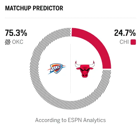 赛前,美媒ESPN预测本场比赛,雷霆胜率75.3%,公牛胜率24.7%。